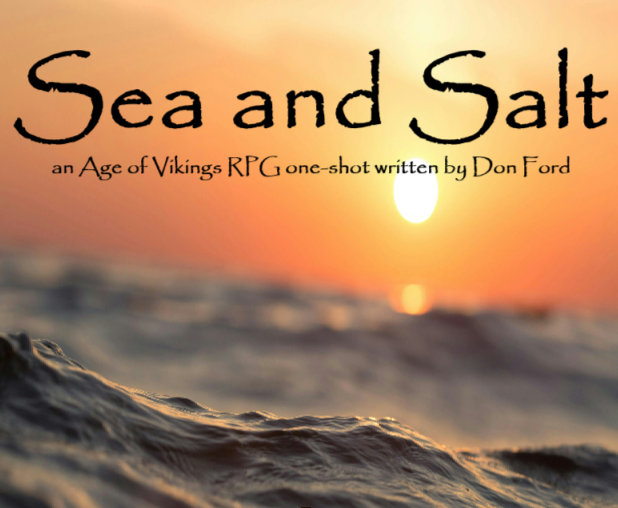 "Sea and Salt" was intended as a short 2 to 3-hour one-shot scenario. The scenario is 2 pages and is based on the 5-step adventure model: Orient/set-up, Travel/explore, Development-Encounter, Analyse/evaluate, Act-finale. My target was to plan, write, layout and publish.