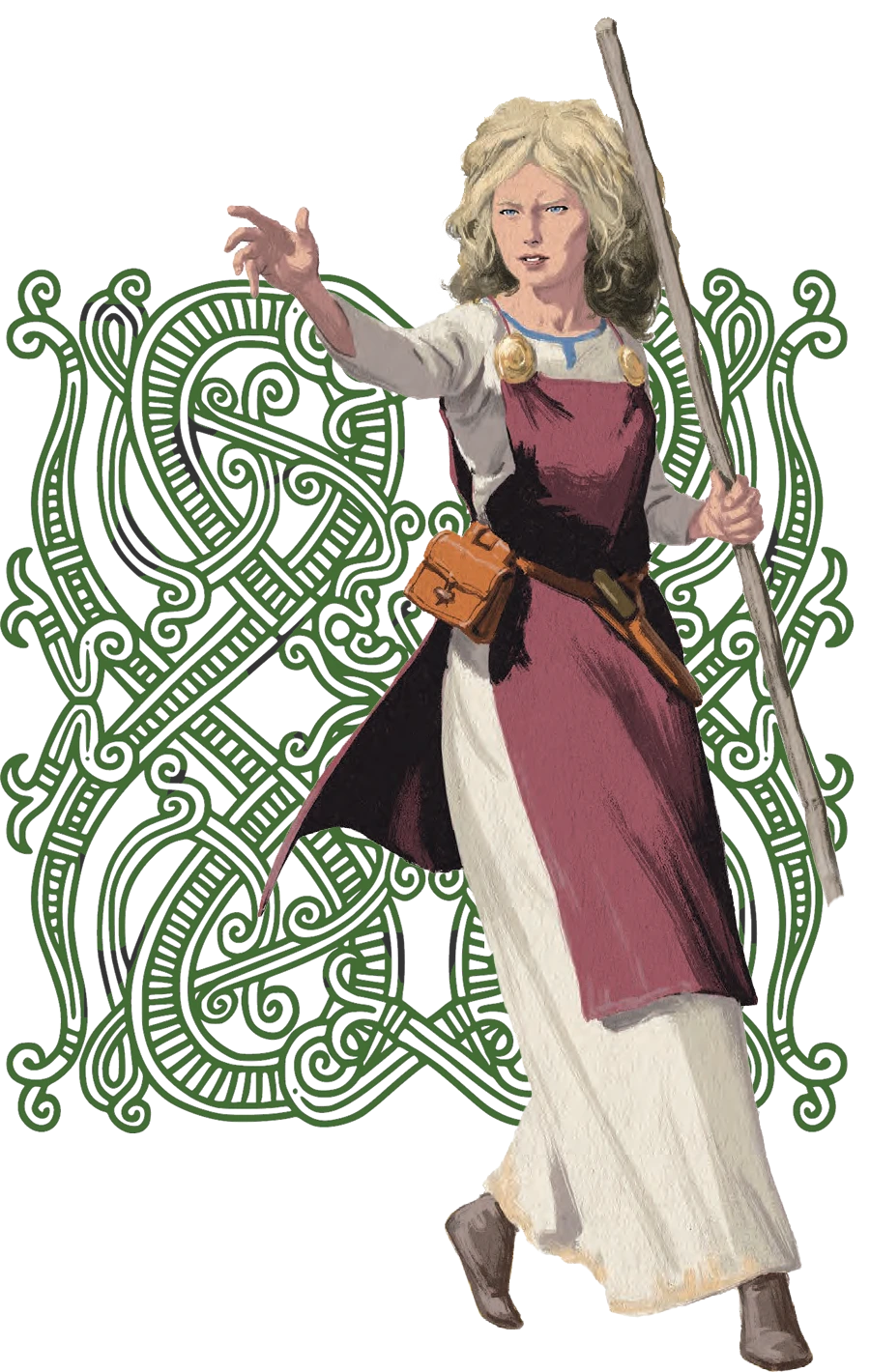 Birna’s father was a wealthy chieftain in Norway but had to flee the country with his pregnant wife when the king decided to take control of his land by force. The journey to Iceland was a very difficult one, and many people perished in the rough seas, including Birna’s father. Birna was born in Iceland and was raised by her father’s cousin who had settled in the country a few years before. While growing up, she traveled the whole of the island with the family, trading goods brought into Iceland by foreign traders. Birna recently married her father’s cousin’s son Kjartan, and the two settled on a farm by the coast. She has a one-year-old daughter named Álfdís. Her farm has two horses, two cows, six sheep, and two thralls.
